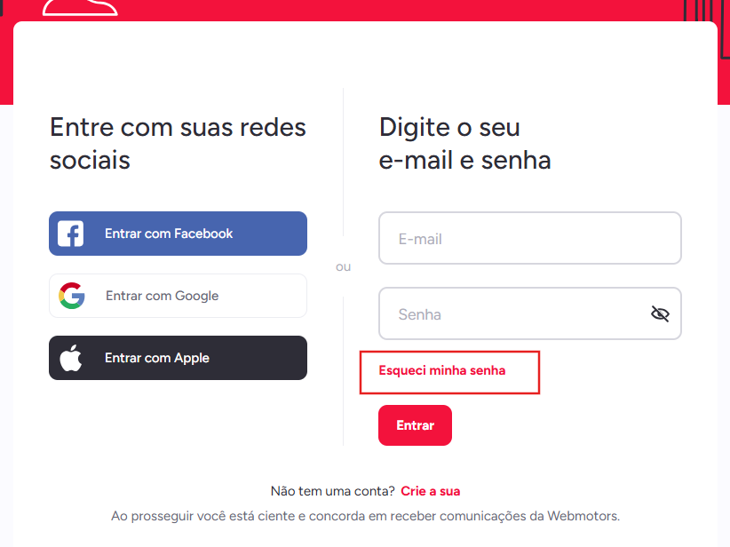 1 - Na tela “Logar ou Cadastrar” acesse a opção “Esqueci Minha Senha”;